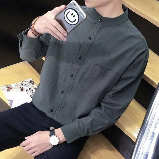 Men’s Linen Long Sleeve Shirt with Stand Collar