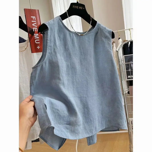 Fashion Bow Lace-Up Cotton Linen Sleeveless Blouse